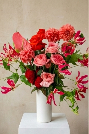 Celebrate her with this vibrant floral masterpiece featuring roses, dahlias, lilies, coxcomb, and anthurium in a joyful composition. Each bloom brings its own personality to the mix, creating a dynamic arrangement that's as fun and fabulous as she is. The delicate petals and gentle fragrance combine to deliver a charming Valentine's Day message—proof that you think she's absolutely stunning.